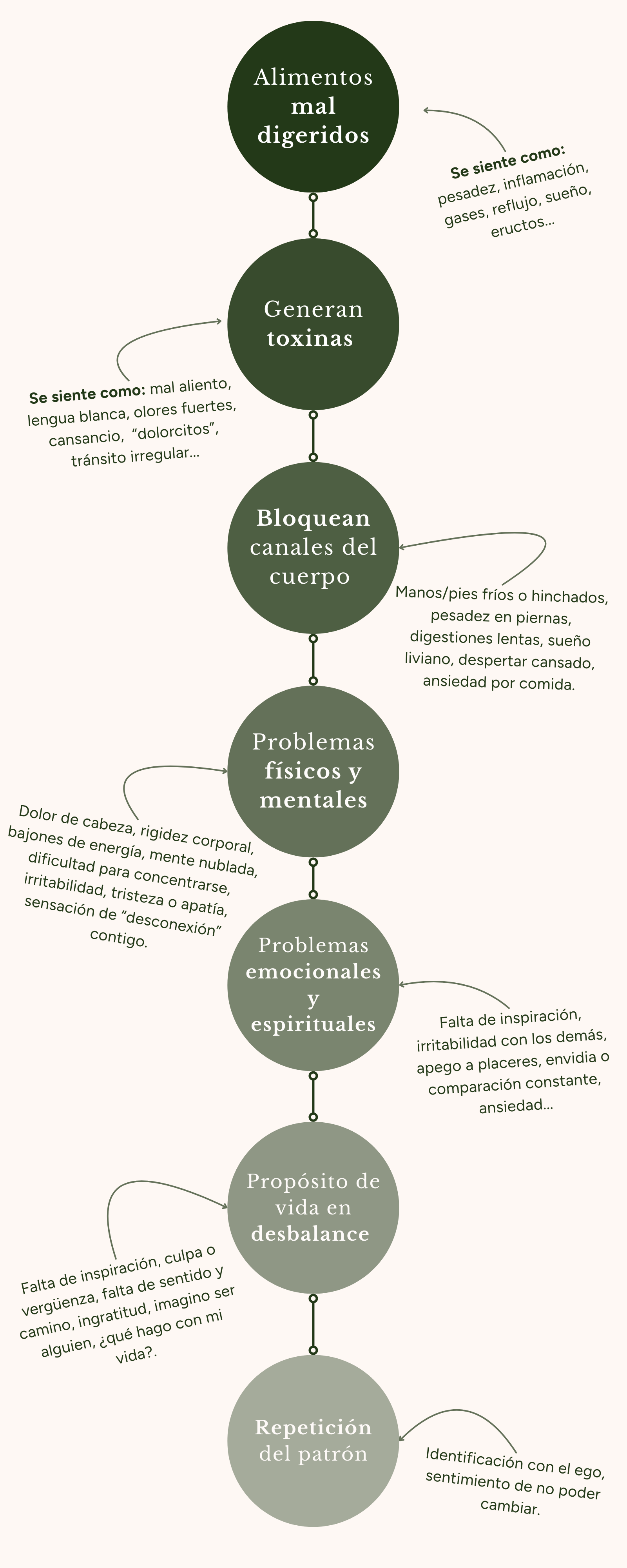 En Ayurveda, todo lo que no podemos digerir (física o emocionalmente) se convierte en toxinas que bloquean lo físico, energético y emocional. Aprender a digerir bien es aprender a vivir con mayor claridad.