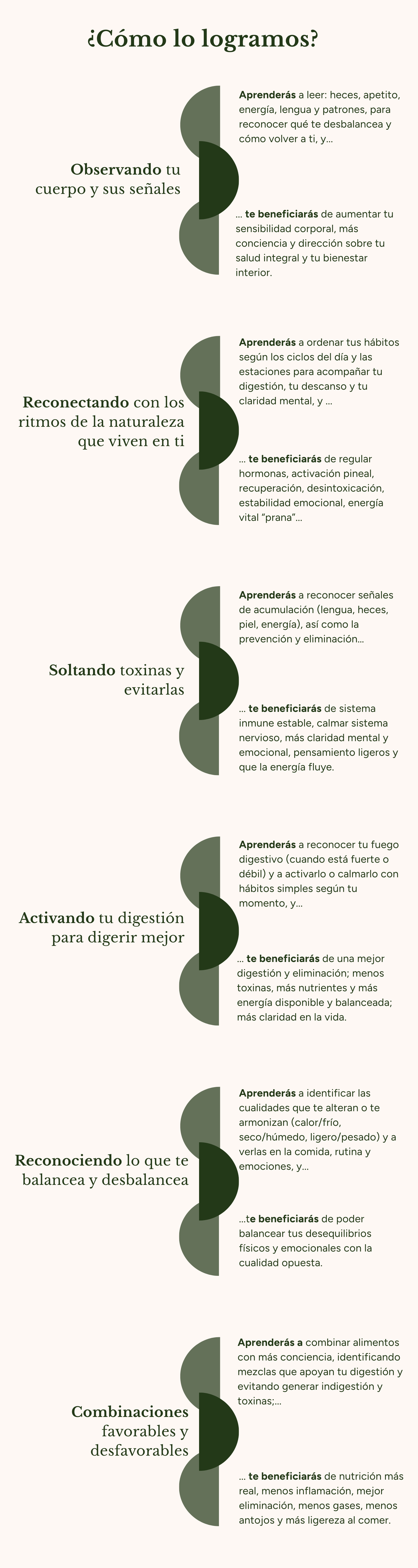 Basado en la armonía de la naturaleza, es importante reconocer que el bienestar no surge de seguir reglas estrictas, sino de aprender a escucharte, entender tus ritmos y tomar decisiones alineadas con tu esencia. Desde la mirada del Ayurveda —ciencia de la vida—, este curso te brinda herramientas prácticas para observar tus sensaciones, identificar lo que te nutre verdaderamente y cultivar hábitos que te sostengan de forma amable y sostenible. Irás despertando una relación más íntima y consciente con tu digestión, tu alimentación y tus emociones. Este curso es tanto para quienes viven con síntomas digestivos como para quienes desean profundizar en su autoconocimiento y fortalecer su bienestar desde adentro.